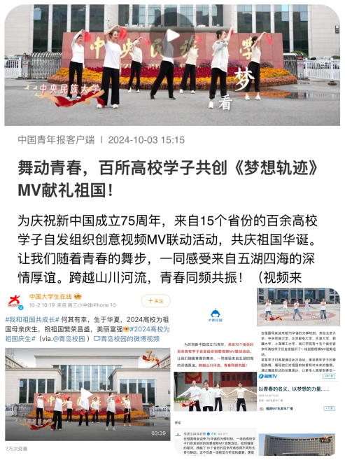 中华人民共和国75周年华诞之际,青岛电影学院积极响应国家号召,以实际行动展现新时代青年的责任与担当,为国庆献上了一份充满活力与创意的礼物。青岛电影学院学子发起并主要承办了2024年全国高校共创《梦想轨迹》MV混剪活动,与全国140余所高校青年学生共同表达对祖国的无限热爱之情。