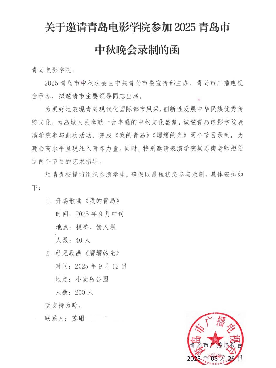 近日,学校表演学院师生受邀参与由中共青岛市委宣传部、青岛市广播电视台联合主办的“明月映山海 中秋月夜游”2025 青岛市中秋晚会的录制工作。此次晚会一改以往传统晚会形式,采用实景录制,并于10月5号晚8点在QTV-1播出,蓝睛同步网络播出。