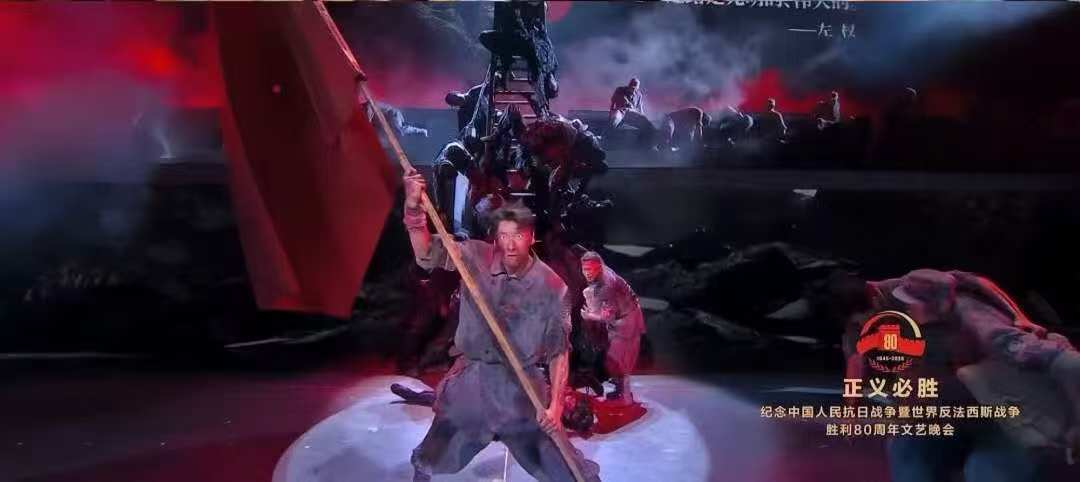 近日,纪念中国人民抗日战争暨世界反法西斯战争胜利80周年文艺晚会《正义必胜》在北京人民大会堂隆重举行。学校美术与动画学院戏剧影视美术设计专业2016级优秀毕业生范雨乔带领团队参与晚会的特效化妆工作。