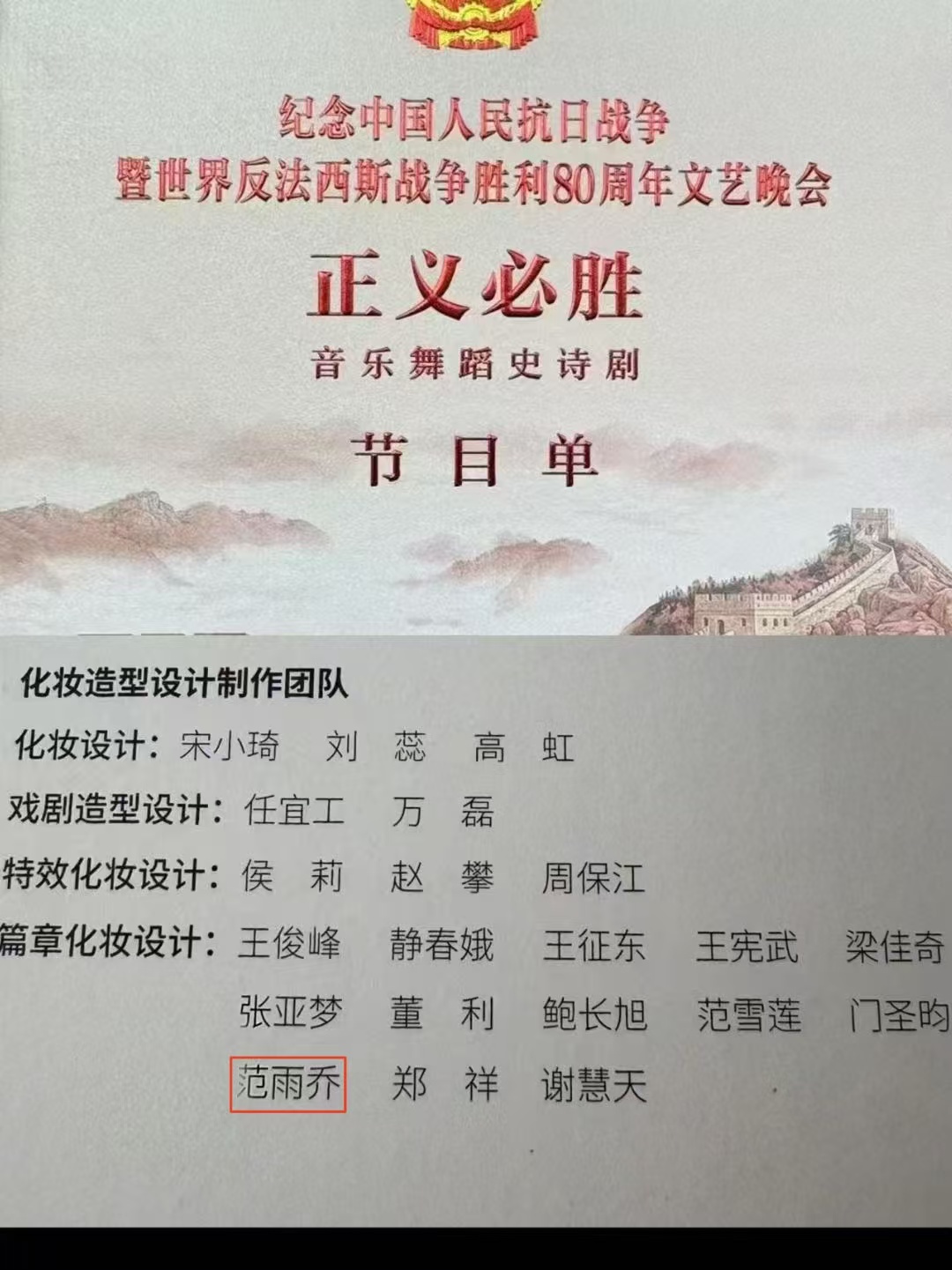 《正义必胜》晚会由中共中央宣传部、文化和旅游部、中央广播电视总台、中央军委政治工作部和北京市共同主办,于今年九三阅兵期间播出。范雨乔团队负责晚会“南京大屠杀”、“血战到底”等历史题材板块的特效化妆工作,精准呈现烧伤、刀伤、枪伤及烟尘等多种舞台妆造效果,既满足了舞台视觉冲击需求,又坚守了历史真实性原则。
