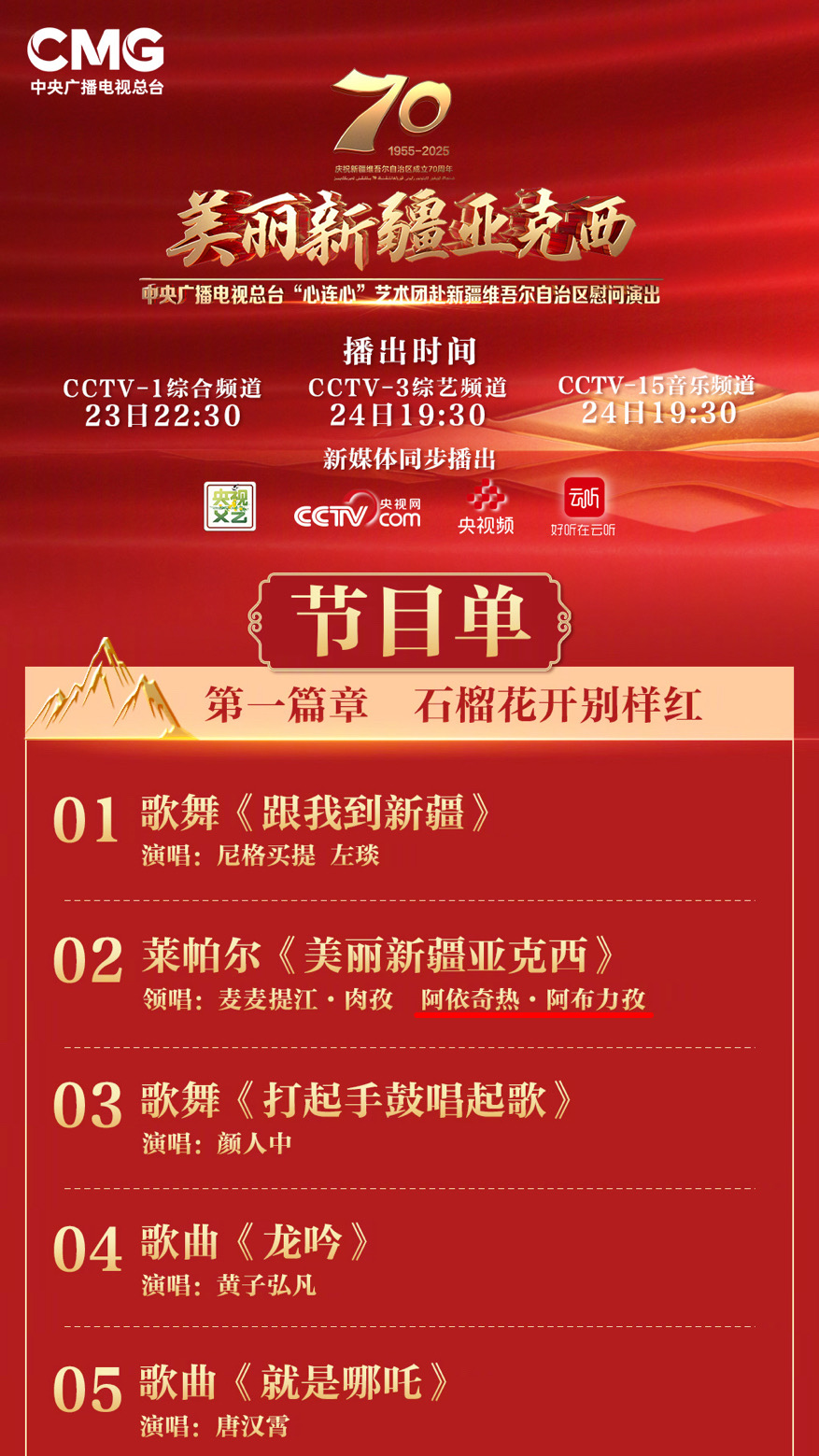 此前,在中央广播电视总台播出的"庆祝新疆维吾尔自治区成立 70 周年——中央广播电视总台心连心艺术团赴新疆慰问演出"中,阿依奇热·阿布力孜已凭借亮眼表现走进全国观众视野。在演出第一篇章"石榴花开别样红"里,她领衔演绎莱帕尔经典曲目《美丽新疆亚克西》,担任领唱的她以清脆嘹亮的嗓音、富有感染力的舞台表演,将新疆各族群众对家乡的热爱、对幸福生活的赞美融入歌声之中,生动诠释了"石榴花开别样红"的团结内涵,让全国观众透过屏幕感受到新疆的独特魅力与蓬勃生机。