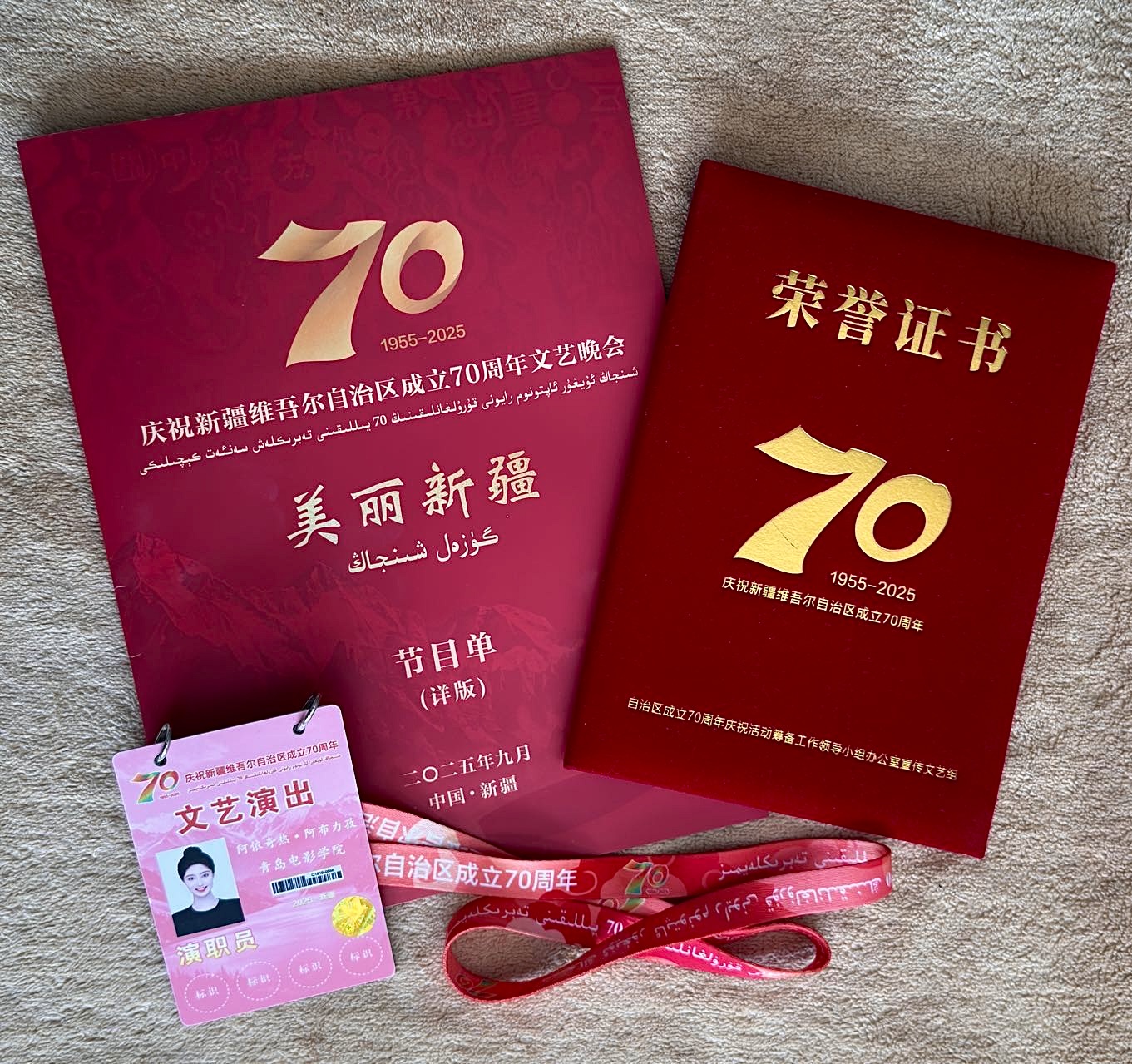 近日,庆祝新疆维吾尔自治区成立 70 周年文艺晚会《美丽新疆》在乌鲁木齐文化中心大剧院隆重举行。学校表演学院学生阿依奇热・阿布力孜参与了晚会第三篇章的语言类节目《一份特殊的关爱》与歌曲《牵挂》的演出,节目通过细腻的艺术表达,展现了党和国家对新疆各族群众的关怀,以及各族人民心连心、共筑美好家园的深厚情谊,赢得现场阵阵掌声。