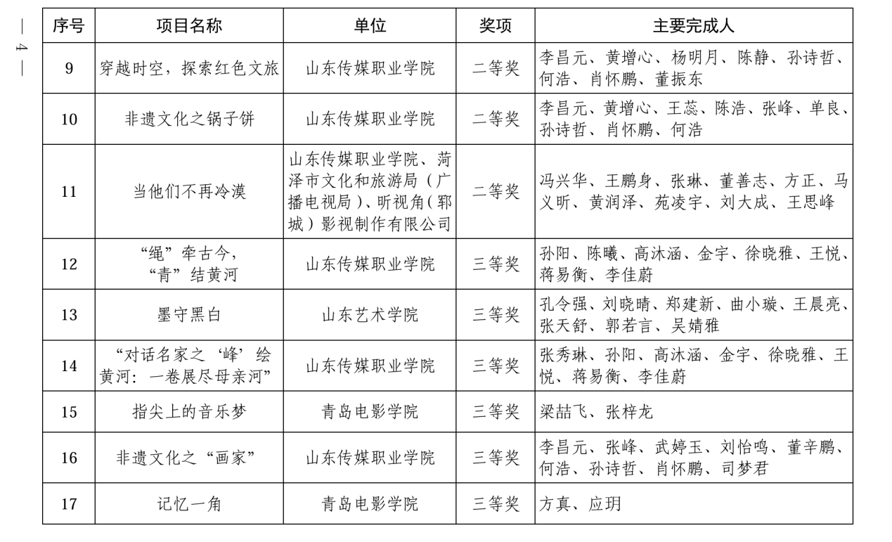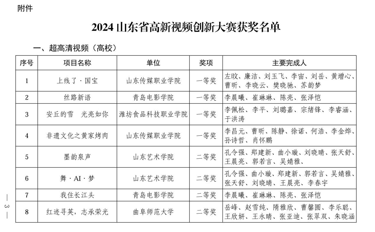 近日,由山东省广播电视局、省教育厅、省科技厅、省工业和信息化厅联合举办的山东省高新视频创新大赛颁奖典礼在山东济南举行,学校师生作品《丝路新语》《我住长江头》《指尖上的音乐梦》《记忆一角》在该赛事超高清视频(高校类)组获一、二、三等奖,学校同步获评“最佳组织奖”。