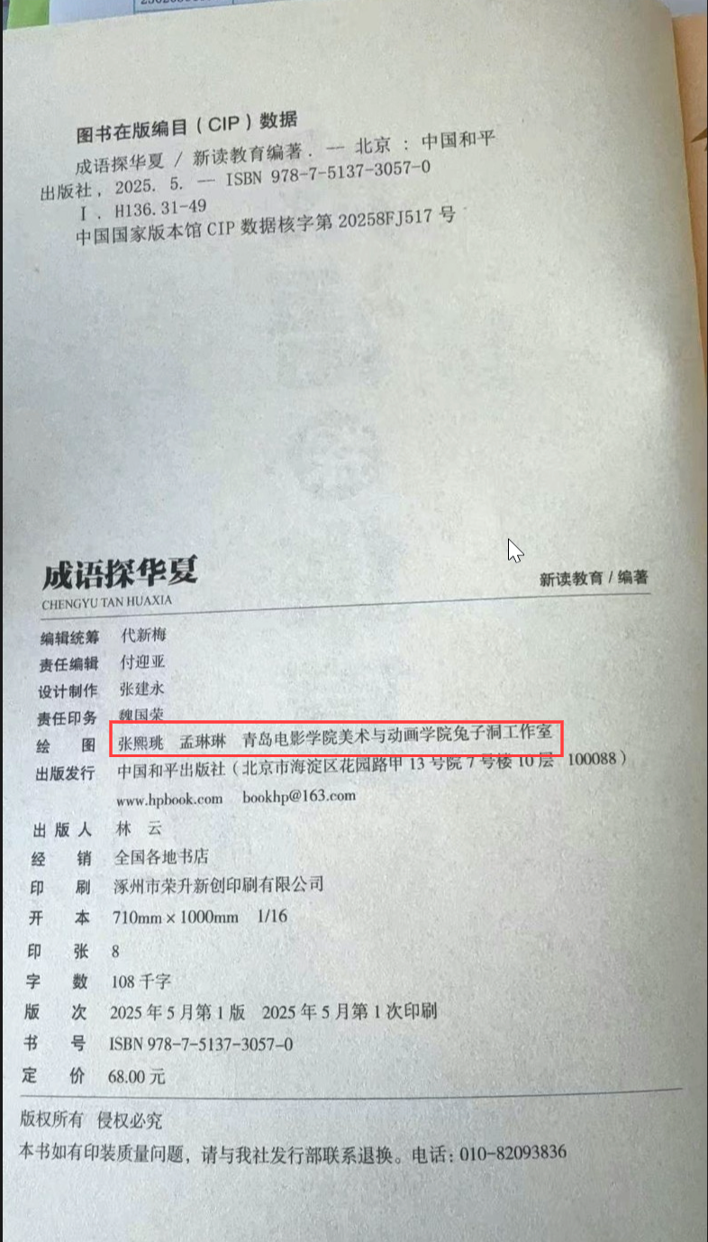 近日,由学校美术与动画学院聂峻老师指导,2023级漫画专业学生张熙珧与2022级漫画专业学生孟琳琳共同创作的文化图书《成语探华夏》在中国和平出版社出版发行。两位同学以扎实的绘画功底、灵动的构图语言与鲜明的艺术风格,将成语故事以生动形象的视觉形式呈现,为本书注入了青春创意与艺术灵感。