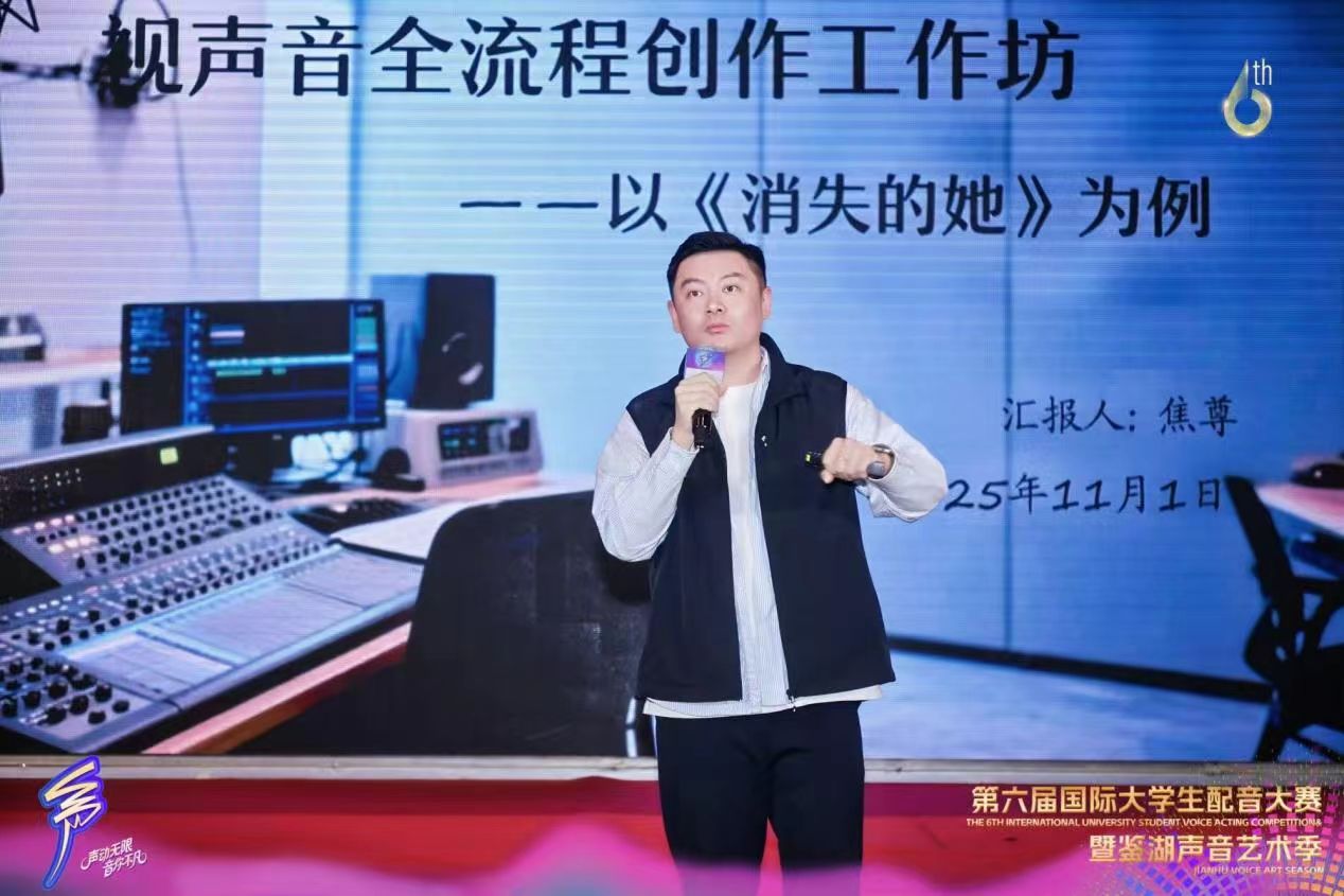 活动期间,新闻传媒学院教师焦尊在第六届国际大学生配音大赛暨鉴湖声音艺术季学术研讨会上,作《青岛电影学院跨专业协同影视声音全流程创作工作坊》报告。他以《消失的她》为例,阐述从前期筹备(影片拆解等)、核心创作(拟音配音等)、后期打磨(试听混音等)到成果展示(联合展映等)的全流程,为教学提供案例参考。