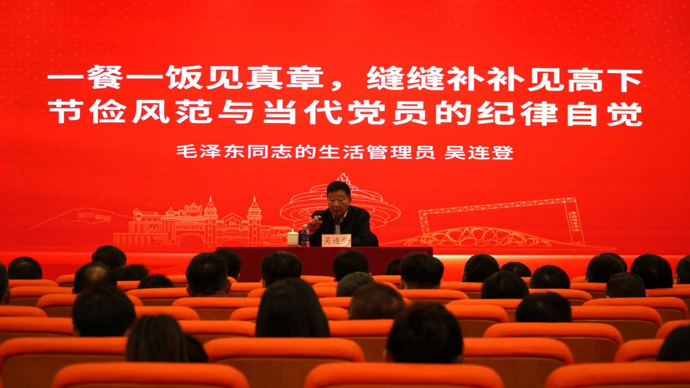 吴连登同志结合自己在毛泽东主席身边工作的亲身经历,通过一系列真实、细腻的生活片段,深情讲述了毛主席一贯秉持的勤俭作风。他谈到,即使在物质条件极为艰难时期,毛主席依然身体力行克勤克俭,始终坚持修旧利废、物尽其用,其朴素本色与严格精神让在场的党员们深受教育与启发。在讲述毛主席心系人民、鞠躬尽瘁的情怀时,吴连登以多个感人至深的具体事例,展现毛主席始终人民的利益置于首位,全心全意为人民服务的崇高境界其言其行中浸润着对人民群众的深沉大爱。