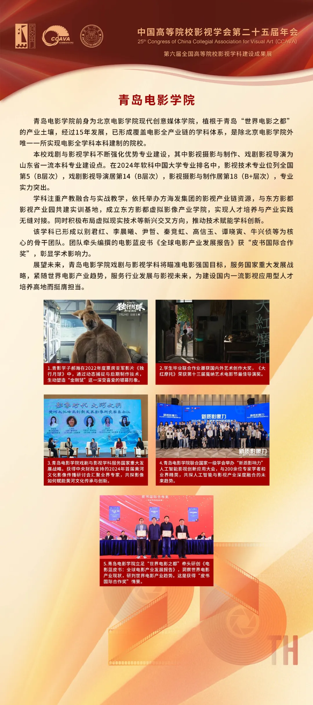 在第六届全国高等院校影视学科建设成果展中,学校成功入选高校学科展板块,是全国受邀参展的43家学科点之一。这充分体现了学界对学校学科建设水平的高度认可。在成果展中,学校系统展示了戏剧与影视学学科的突出优势:作为除北京电影学院外唯一一所实现电影全学科本科建制的院校,已形成覆盖电影全产业链的学科体系;影视摄影与制作、戏剧影视导演专业为山东省一流本科专业建设点;在2024年软科中国大学专业排名中,影视技术、戏剧影视导演、影视摄影与制作等专业排名居全国前列,展现了雄厚的专业实力。