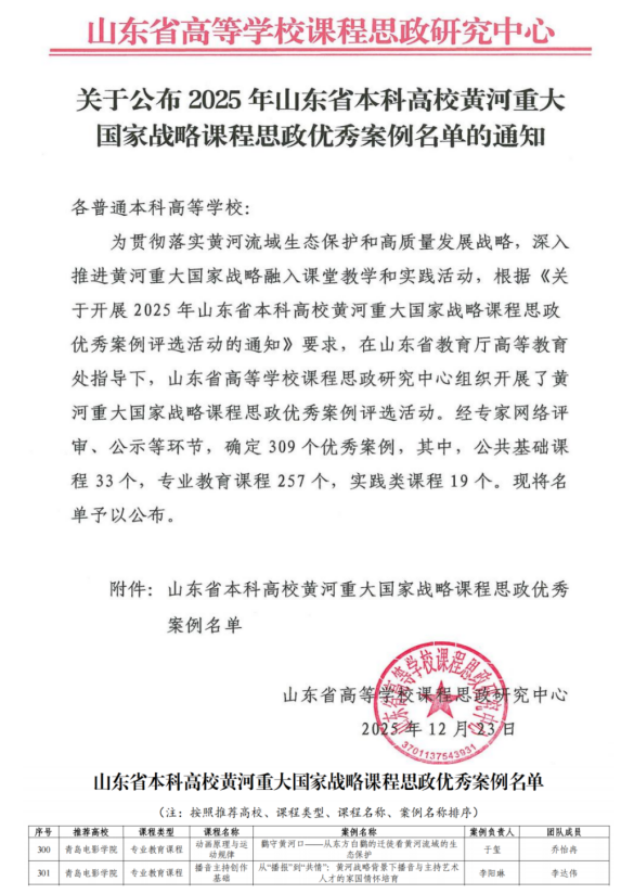 近日,山东省高等学校课程思政研究中心公布2025年山东省本科高校黄河重大国家战略课程思政优秀案例名单,学校美术与动画学院教师于玺的《鹳守黄河口——从东方白鹳的迁徙看黄河流域的生态保护》案例和新闻传媒学院教师李阳琳的《从“播报”到“共情”:黄河战略背景下播音与主持艺术人才的家国情怀培育》案例成功入选。