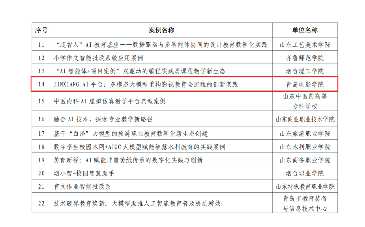 1月5日,山东省教育厅正式发布《人工智能大模型赋能教育典型案例及创新应用场景名单》,学校申报的“JINXIANG.AI平台:多模态大模型重构影视教育全流程的创新实践”成功入选省级人工智能教育典型案例,成为全省27项典型案例之一。此次入选标志着校在“人工智能+影视教育”融合创新领域取得重大突破,为全省高校提供了可复制、可推广的范式。