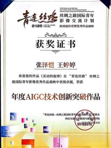 此外,2026“青连丝路”丝绸之路国际青年影像交流计划优秀作品展映结果正式揭晓,学校文学与导演学院教师王婷婷、学生张泽恺创作的AIGC短片《灵动的旋律》凭借突破性的技术应用与深厚的文化表达,从全球众多参赛作品中脱颖而出,成功斩获“年度AIGC技术创新突破作品”大奖。短片运用AIGC视频技术回溯至汉代,生动再现了华夏先民种桑养蚕、抽茧织绸的智慧历程,艺术化呈现了世界上第一次以丝绸为主角的中外贸易大通道——丝绸之路的壮阔启航。作品深刻诠释了中华民族血脉中开放包容、造福世界的情怀,并指出丝绸在当代依然是高端用品的代表,守护与分享这一人类文明瑰宝,是当代青年的责任与使命。