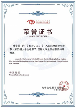由2023级戏剧影视导演专业学生陈姿霖执导、严世铭担任摄影的纪录片《你好,豆丁》,以其深刻的主题和细腻的镜头语言,成功入围北京国际电影节·第33届大学生电影节(第26届国际大学生原创影片推选)的终审环节。国际大学生原创影片推选是北京国际电影节·第33届大学生电影节的核心单元,该单元自创办以来已成功举办二十六届,赛事以“大学生办、大学生看、大学生评、大学生拍”为特色,本届共收到海内外1500余部作品,经多轮匿名评审,最终110部入围。