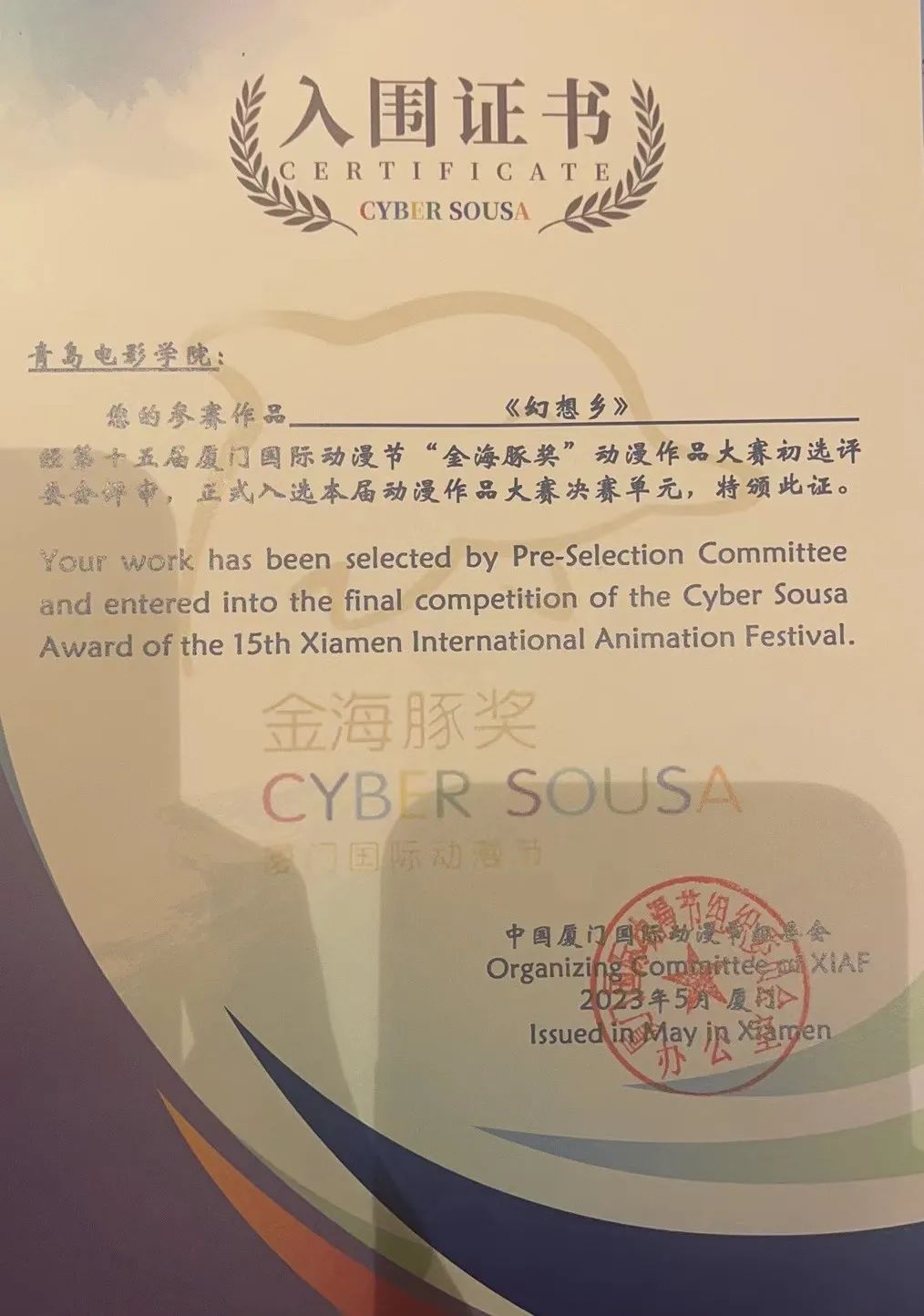 动漫艺术系学生季康武的参赛作品《幻想乡》经第十五届厦门国际动漫节“金海豚奖”动漫作品大赛初选评委盘评审,正式入选本届动漫作品大赛决赛单元。