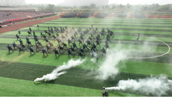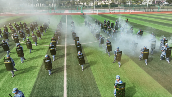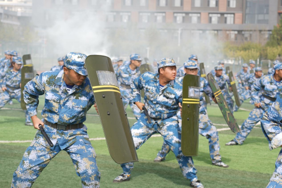 参训同学们还进行了军体拳、警棍盾牌操和防爆队形表演,展示了青影学子展英姿、强国有我正当时的决心和气概。