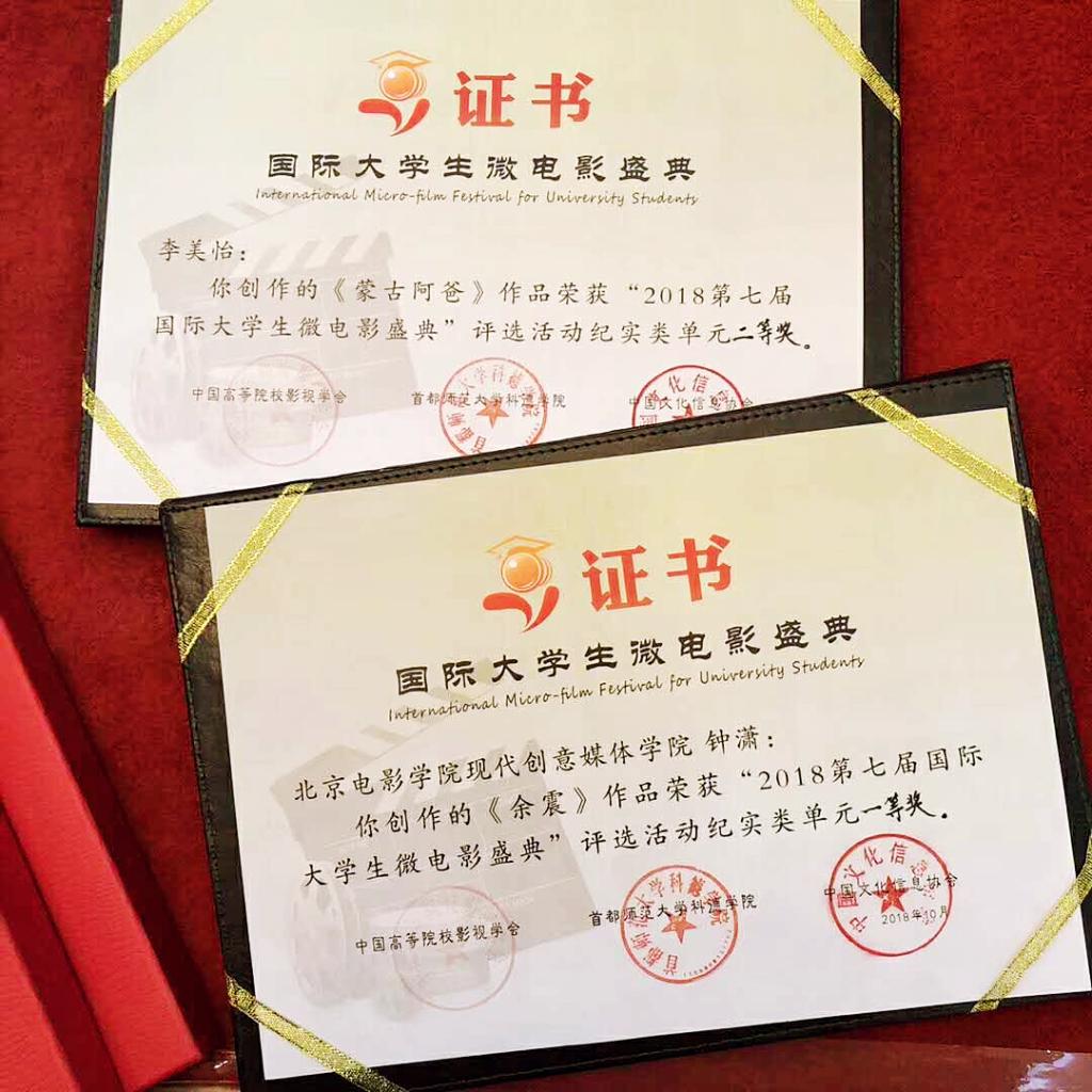 10月21日,我院2018届毕业联合作业《余震》、《蒙古阿爸》在2018第七届国际大学生微电影盛典评选活动中分别荣获纪实类单元一等奖、二等奖。