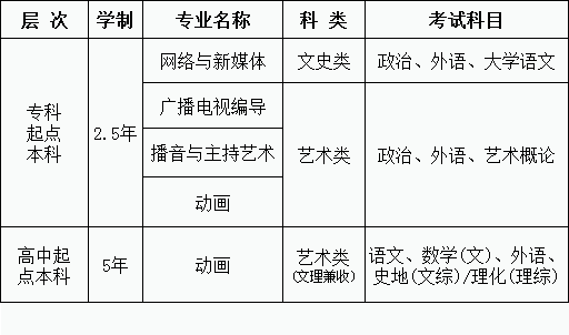 2023年我校共招生5个专业,其中专科起点本科4个专业:网络与新媒体、广播电视编导、播音与主持艺术、动画;高中起点本科1个专业:动画。
